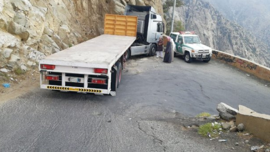 شاهد.. إنقاذ قائد شاحنة متهور حاول النزول لعقبة “سنان” الخطرة معرضاً حياته للخطر